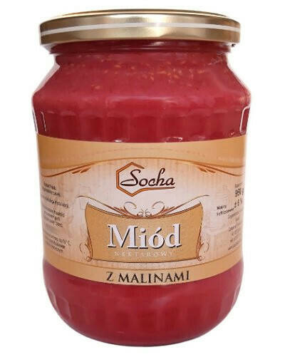 Miód z malinami jest to połączenie miodu wielokwiatowego (kremowanego) z maliną liofilizowaną (5%). Połączenie słodkiego smaku miodu z cierpką i kwaskową maliną to eksplozja smaków, którą każdy musi spróbować. Miód wielokwiatowy posiada szerokie zastosowanie w profilaktyce chorób m.in alergie, katar sienny, choroby układu krążenia i wątroby. Polecany dla dzieci, również w stanach przeziębienia i grypy. Dodatkowo malina zawarta w miodzie ma działanie przeciwzapalne, przeciwbakteryjne i przeciwgorączkowe.